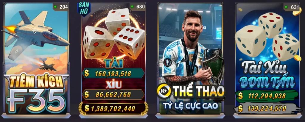 - Game bài đổi thưởng: Không gian sòng bài sống động, chân thực như thật với tất cả các trò chơi bài như Tiến Lên Miền Nam, Phỏm, Mậu Binh, Sâm Lốc, Blackjack, Poker và nhiều hơn nữa.