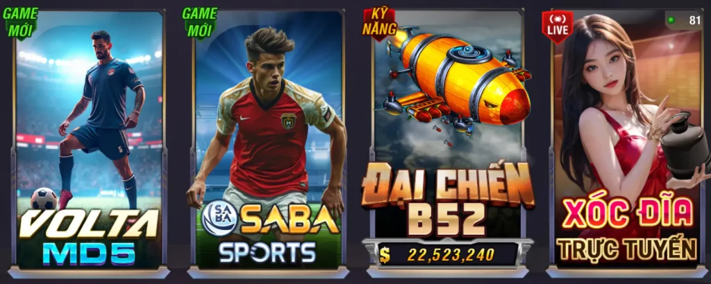 - Thể thao: Cá cược nhiều môn như bóng đá, bóng chuyền, cầu lông, đua xe,… với tỷ lệ kèo hấp dẫn và cập nhật liên tục theo trận đấu.